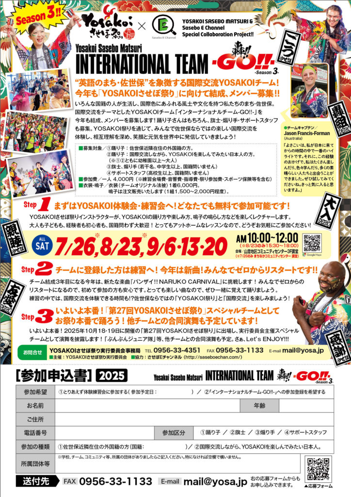 Our amazing Yosakoi Dance team, “International Team -GO!!-,” will be back in full force! Now the team needs members. Sasebo E Channel has been supporting this team since the beginning of 2023. This year, we’ll use a NEW SONG! Let’s learn the dance moves together and show our performances at the 27th YOSAKOI Sasebo Matsuri on October 18 and 19, 2025. Beginner-friendly! We will be holding practice sessions until the festival day. Feel free to participate in a couple of the sessions for FREE by September 20th, the member application deadline.